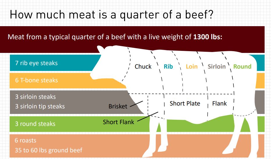 A 1/4 of Beef includes cuts from the front and back of the steer. It is referred to as a “half of a half” since the cuts from the front and back are divided equally between 2 quarters.